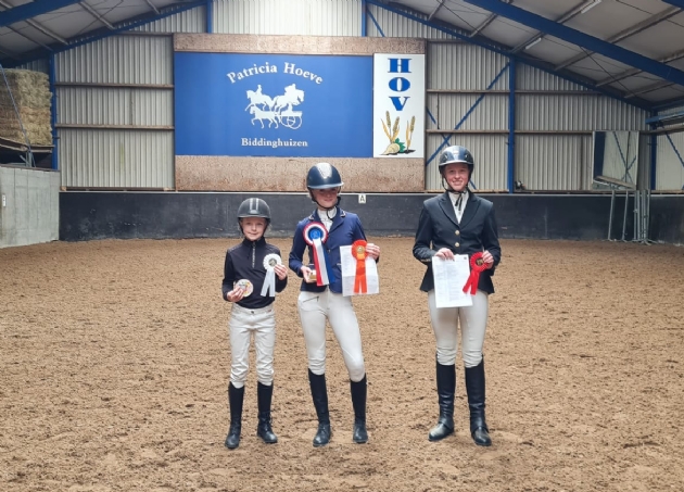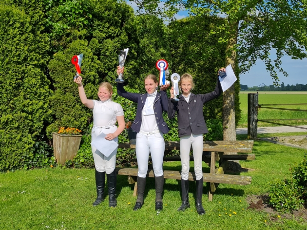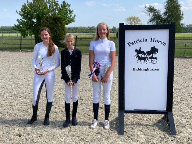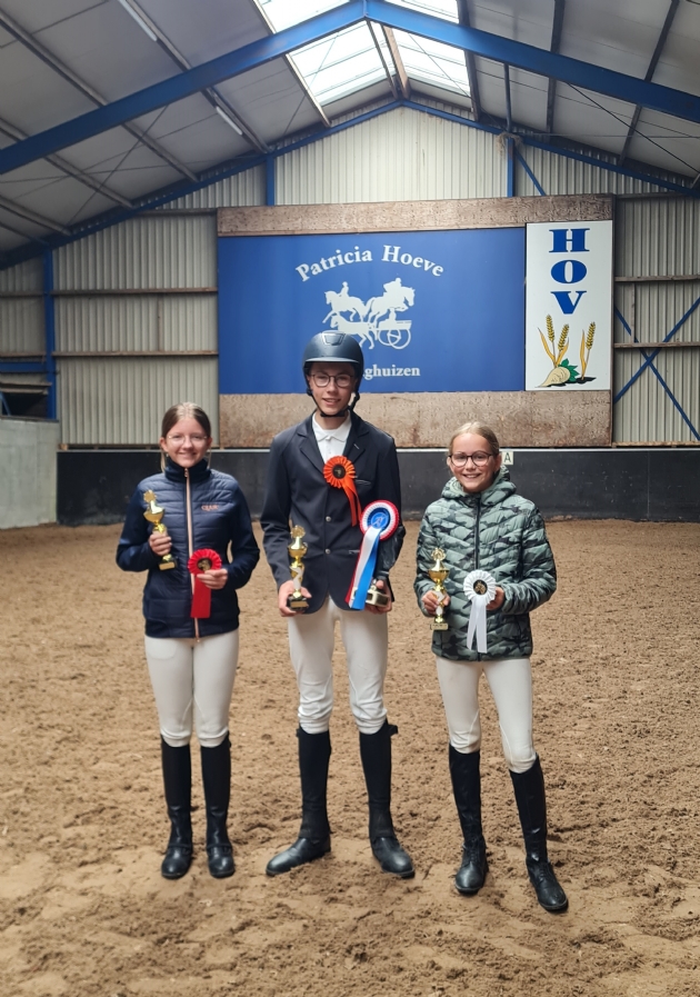 De winnaars van vorig jaar om de Patricia Bokaal Dressuur: Senna Hengeveld (Indy, 2e plaats), Elyne Hillebrand (Joey, 1e plaats) en Yara Zaal (Lana, 3e plaats).